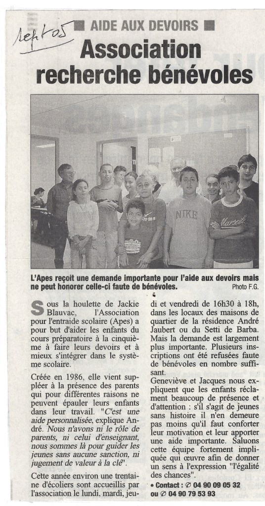 Vous remarquerez que nous avons eu une thématique un peu obsessionnelle : trouver des bénévoles. Mais cela prouve, si nous en doutions, que la demande des enfants et des parents est toujours là, que l’aide aux devoirs est indispensable.